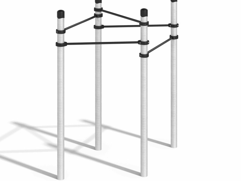 Комплекс типа "Воркаут": Воркаут-комплекс из 5 турников. Габаритные размеры 2374 х 1416 х 2650 мм. Функциональные элементы комплекса: Перекладины (5 ед.): L-1200мм, D-34мм, разноуровневые: H-2400 мм, 2300мм, 2100мм, 2100мм, 1900мм. Опоры (вертикальные столбы): диаметр 108 мм Элементы комплекса фиксируются к опорным столбам при помощи литых хомутов. Материал: столбы - алюминий, навесное оборудование и хомуты порошковая покраска. |