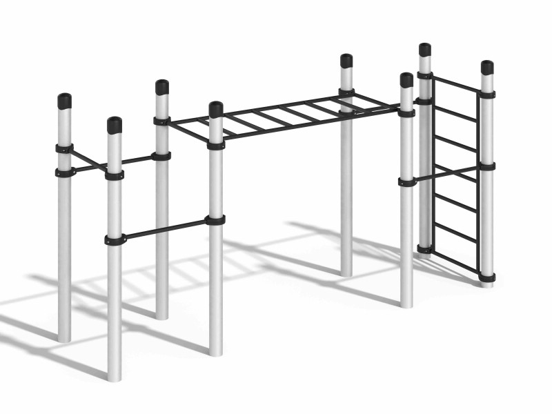 Комплекс типа "Воркаут": Хатанга. Габаритные размеры 3850 х 1020 х 2050 мм. Функциональные элементы комплекса: Перекладины (5 ед.): L-800мм, D-34мм, разноуровневые: H-1483 мм, 1583 мм, 1383 мм, 1083мм, 1083мм. Рукоход: состоит из перекладин. Длина секции 1900 мм.: H-1683 мм. Шведская стенка: состоит из перекладин, расстояние между которыми 274 мм. Ширина шведской стенки 800 мм, высота 1644 мм. Опоры (вертикальные столбы): диаметр 108 мм Элементы комплекса фиксируются к опорным столбам при помощи литых хомутов. Материал: столбы - алюминий, навесное оборудование и хомуты порошковая покраска. |